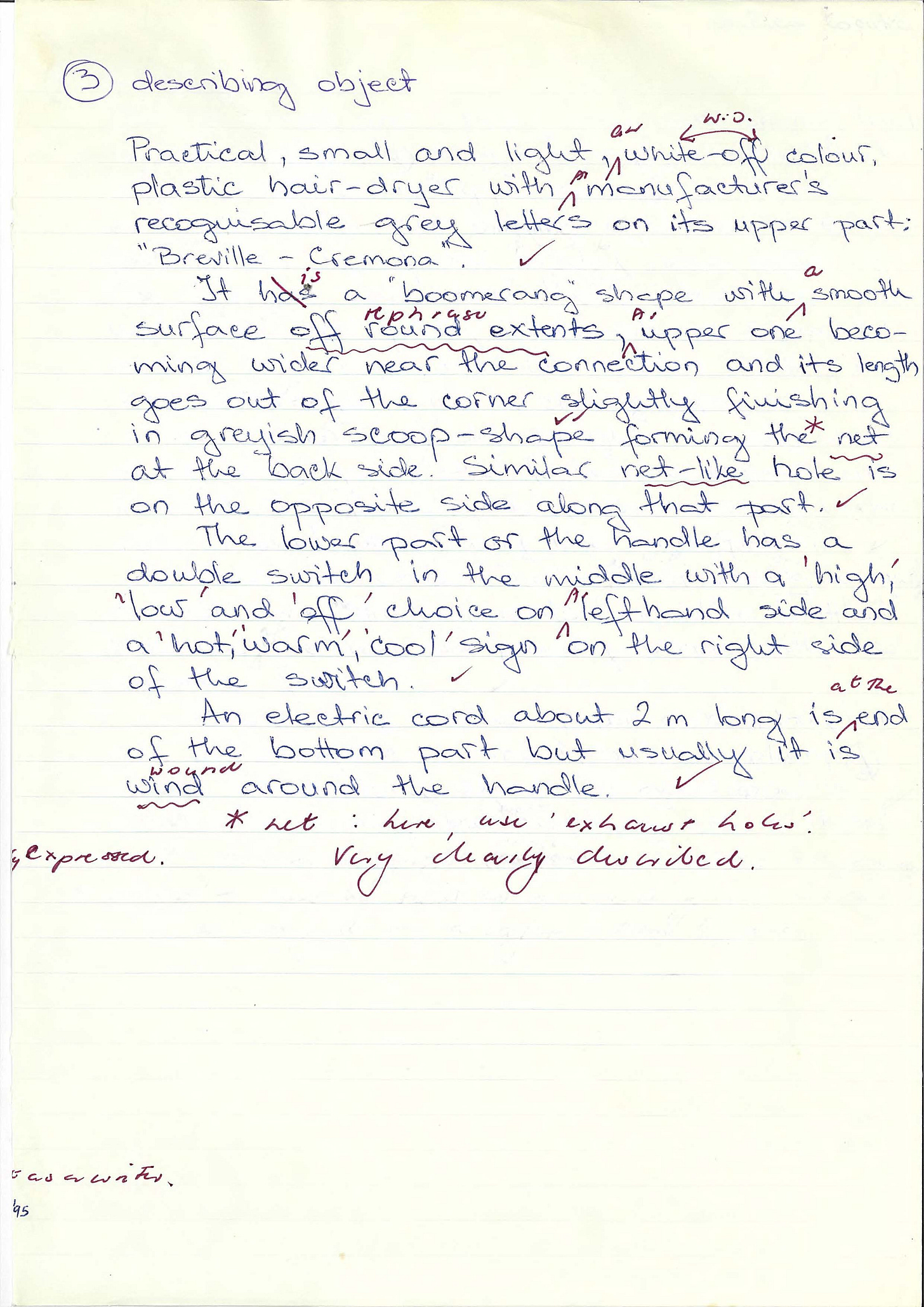 Practical, small and light, an off-white in colour, plastic hairdryer with a manufacturer’s recognisable grey letters on its upper part: ‘Breville – Cremona’.